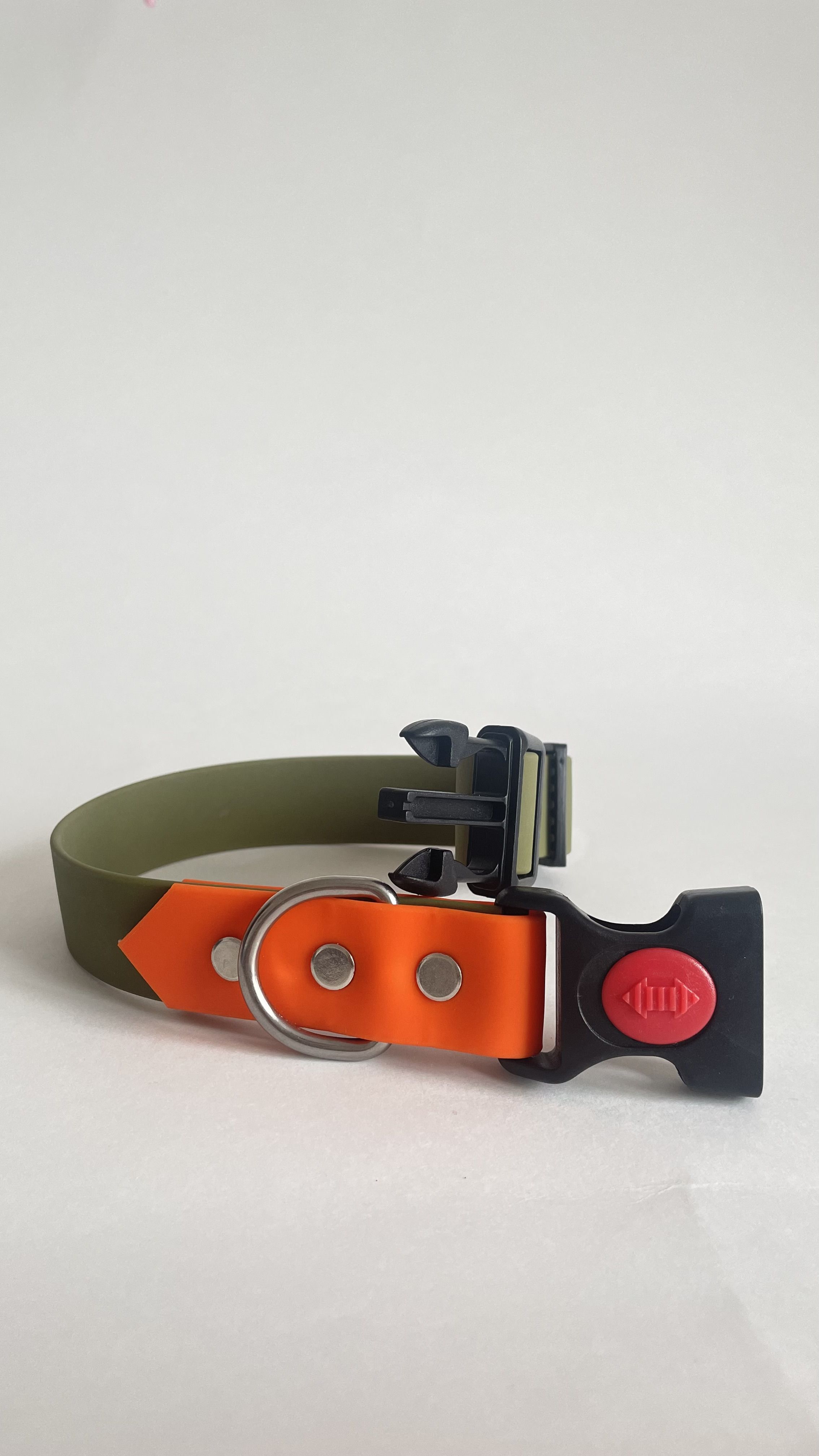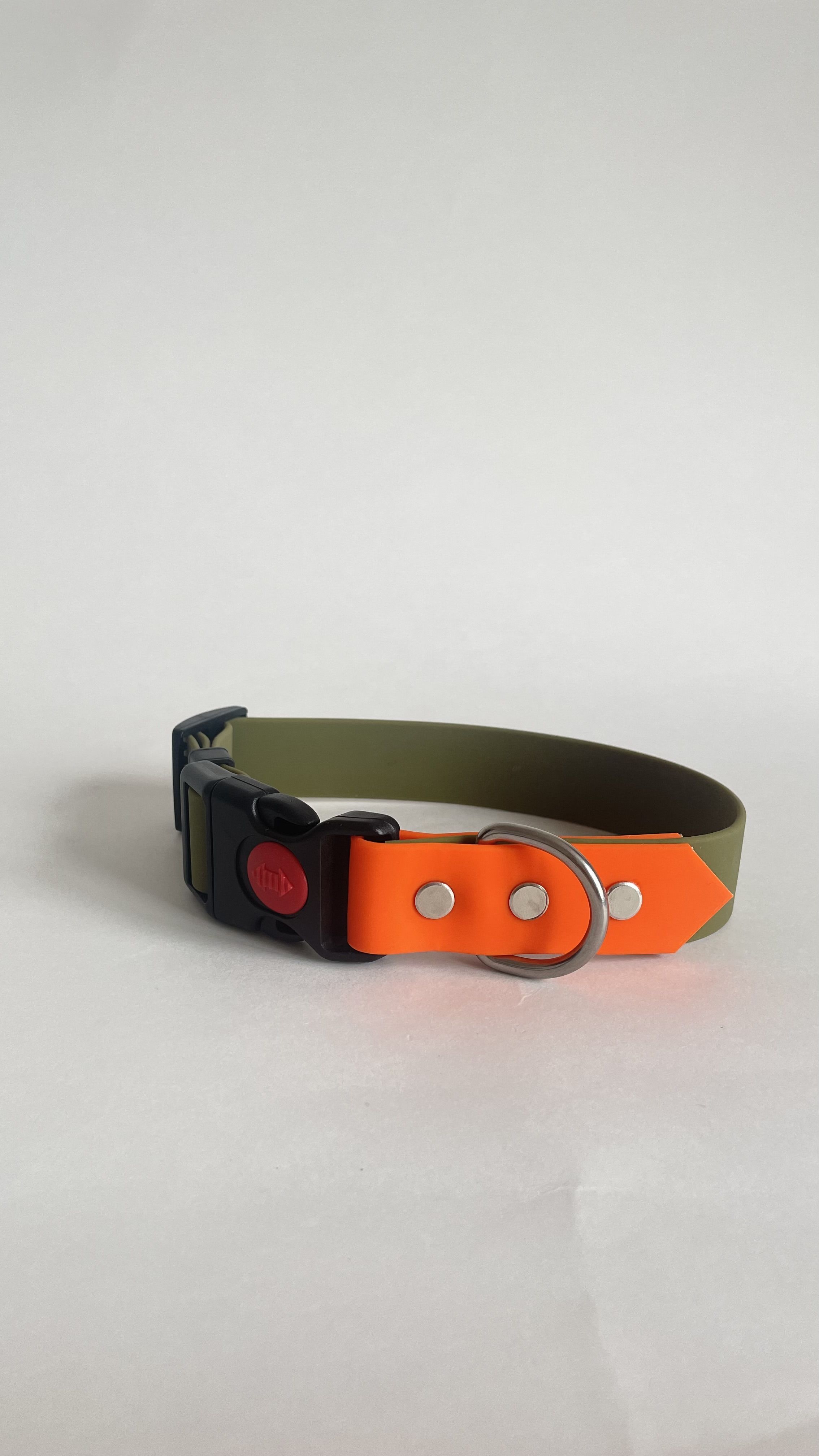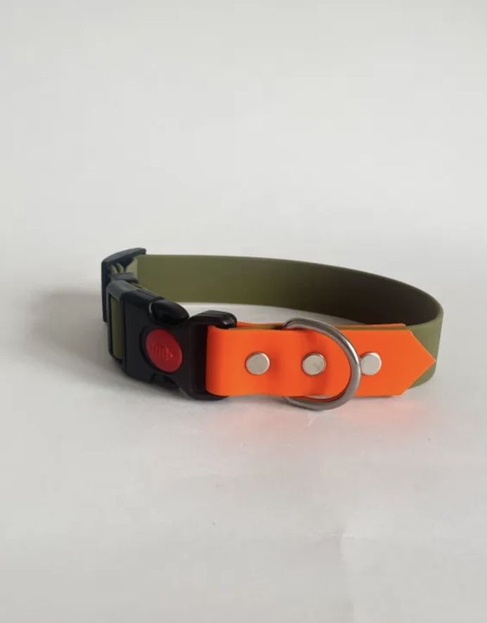 Ошейник для собак из биотана Yki too — эксклюзивный дизайн, прочный и стильный ошейник для повседневного использования. Материал устойчив к влаге, сохраняет форму даже при активной игре, а яркие тона хаки и оранжевого обеспечивают высокую видимость в темное время суток.