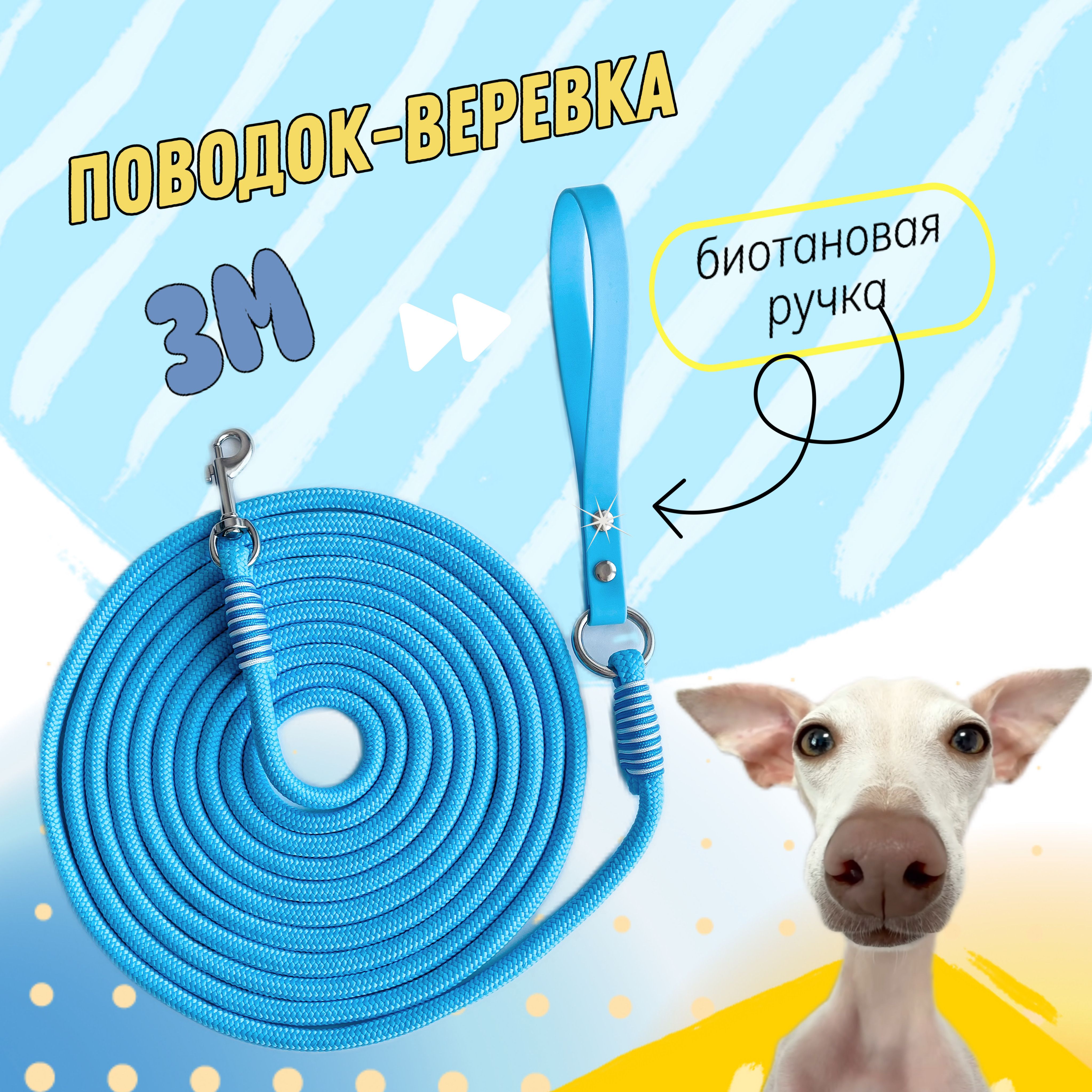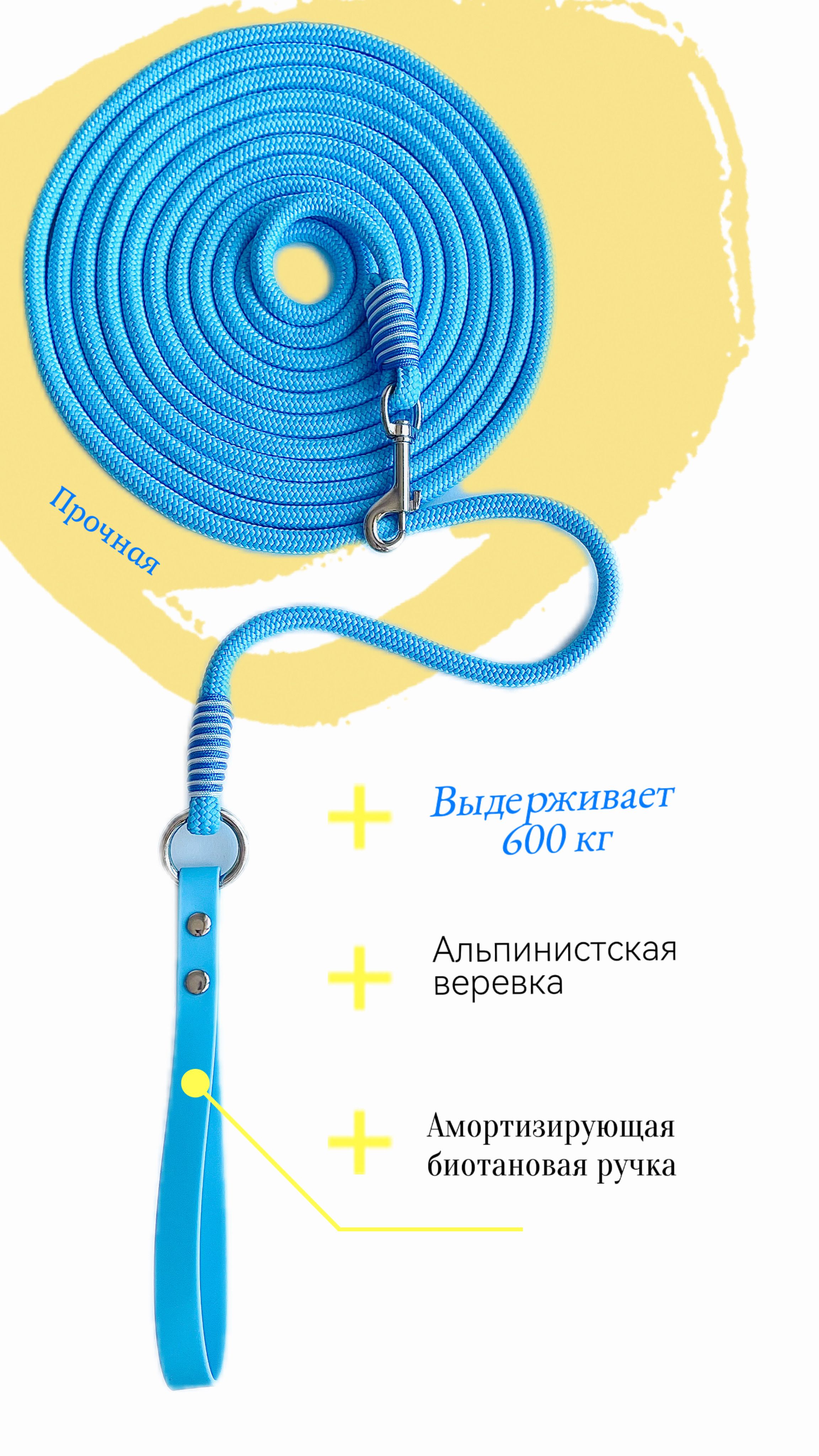 Биотановая ручка гарантирует удобство хвата, не натирает руку и остается мягкой на ощупь в любых погодных условиях. Поводок веревка для собак имеет прочную конструкцию, что обеспечивает контроль над питомцем даже в самых неожиданных ситуациях.