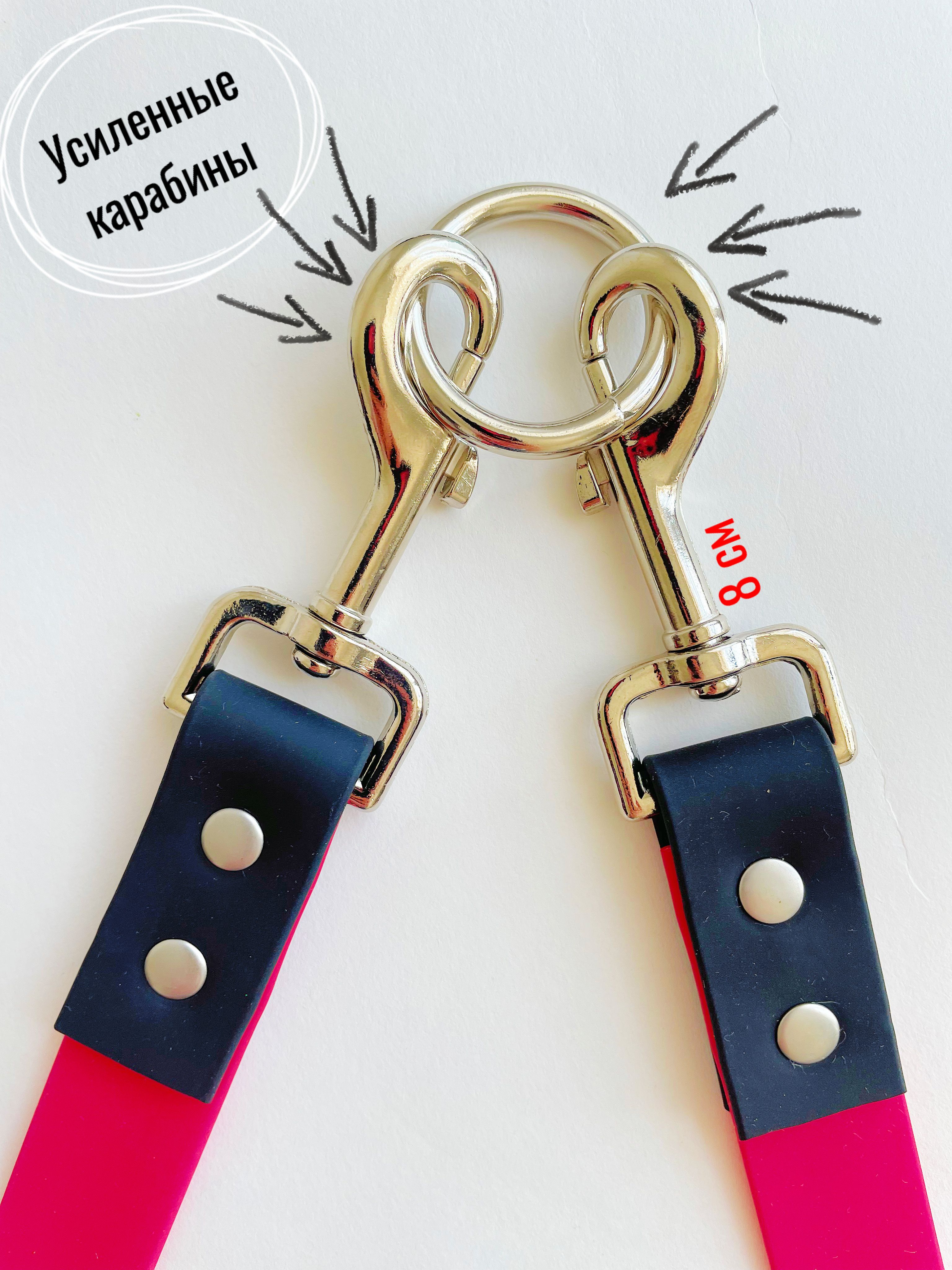 Поводок-сворка из водонепроницаемого материала БИОТАН. Сворка для двух собак. Поводок из Биотана для собак крупных и средних пород. Поводок предназначен для выгула или дрессировки двух собак одновременно. 100% гарантия прочности разрывной силы , выдерживает большие рывки. Уникальная конструкция, одной стороны усиленный карабины надёжен и сможет выдержать вес даже очень большой собаки. Карабин с вращающимся механизмом, что предотвращает закручивание и запутывание поводка. И с другой стороны – карабины , через кольцо сварное зацепляется основной поводок. И карабин, и кольцо закреплены с помощью двух клепок, что гарантирует надежность соединения.