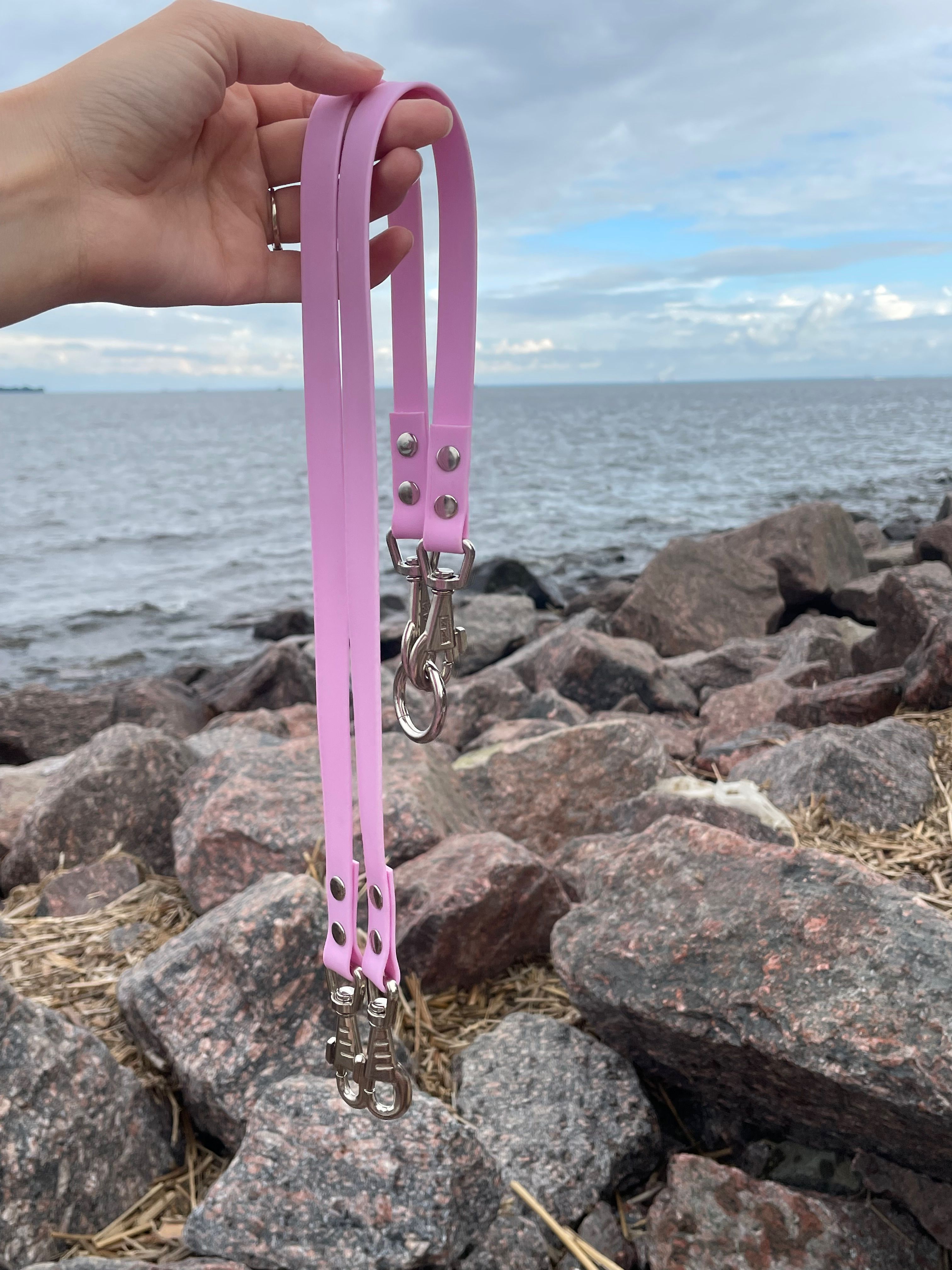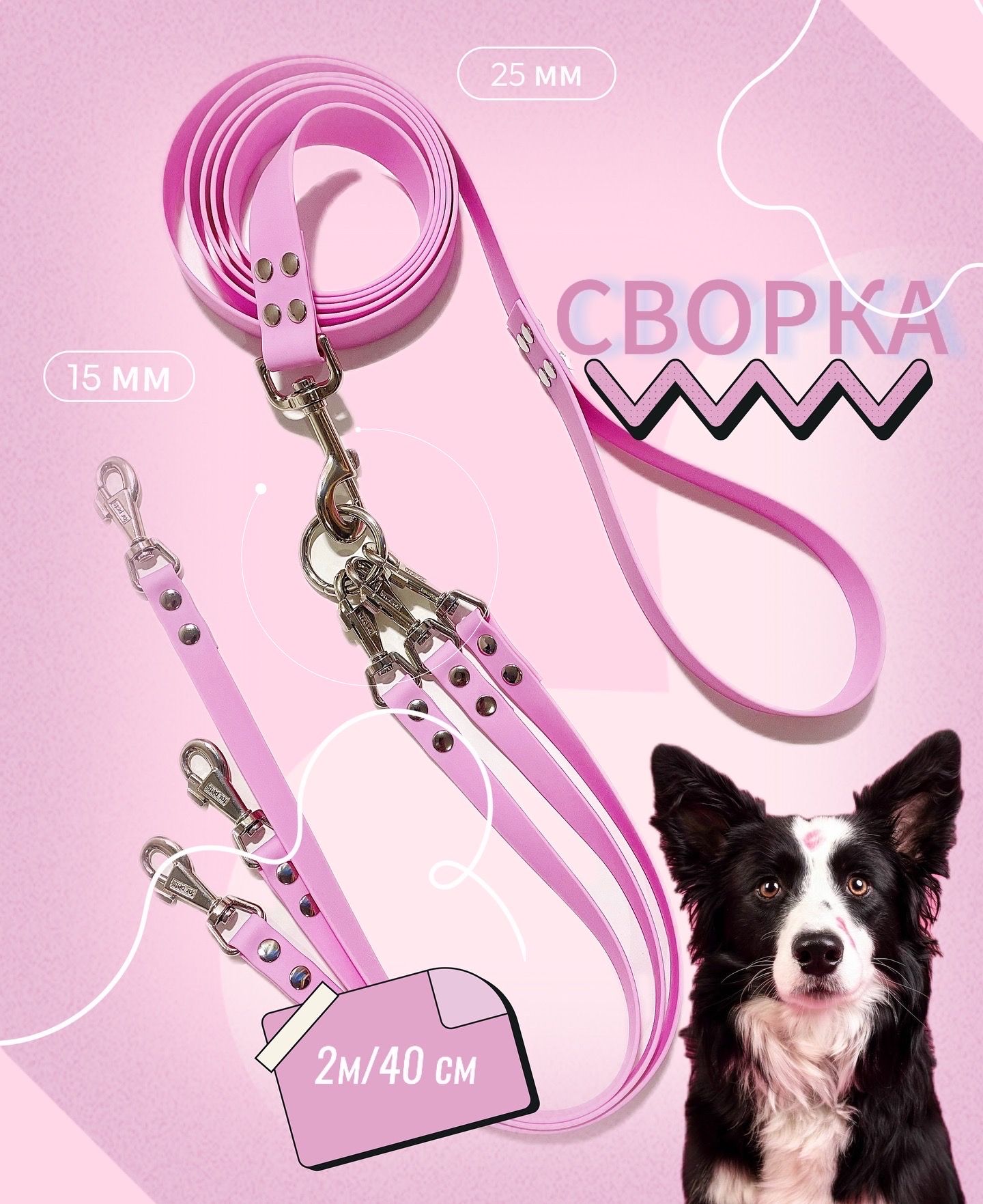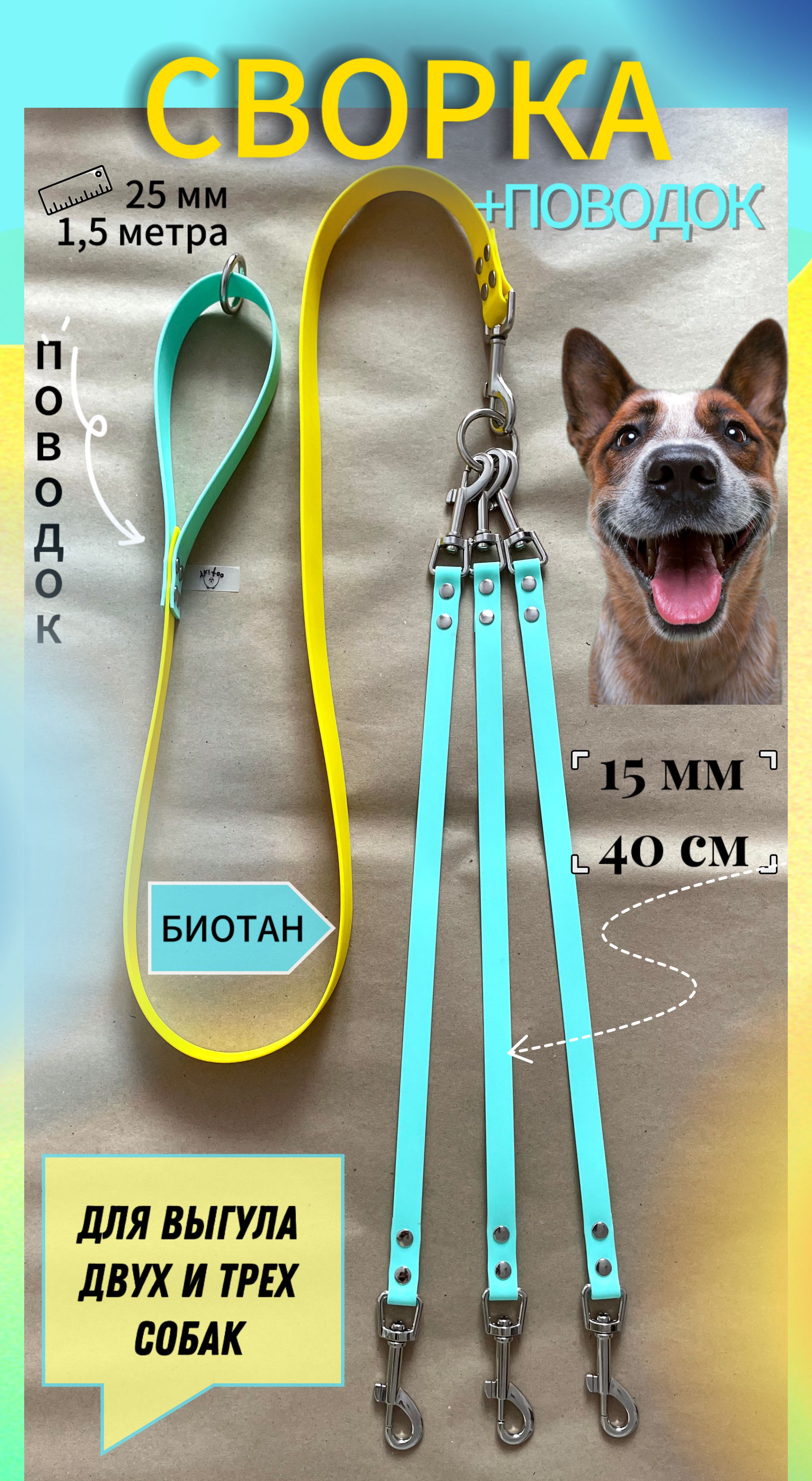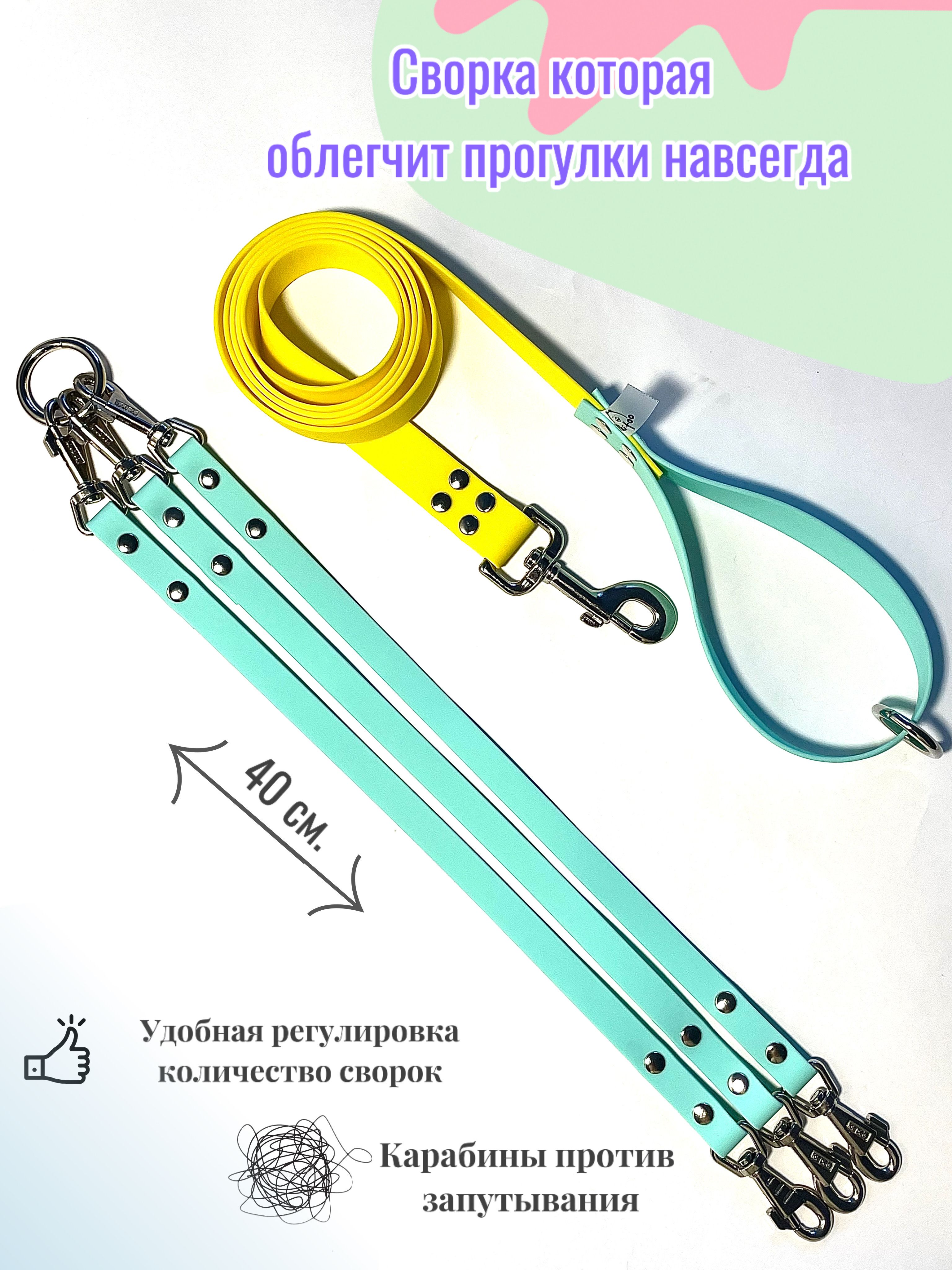 Сворка на 2 собачки , материал биотан. Подходит для мелких, средних пород собак. Карабины серии PET для собак , усиленные, прочные и надежные. Вся конструкция из Биотана, 15 мм ширина. Сводки 70 см , с двух сторон карабины. Сворка для собак создана для того , что бы было удобно гулять одновременно с двумя и более собак . Створки с двух сторон на карабинах , серии PET , усиленные с вертлюгом. Ветлуг удобен в том, что бы при перемещении собачек они не запутывались и могли спокойно меняться местами. Кольцо сварное очень прочное, выдерживает нагрузку 300 кг. Данная сворка удобна тем, что если вы пошли гулять с одной собакой , одну сварку для собаки отстегиваете и оставляете дома или удлиняете поводок прицепив сворку к сварке. Биотин имеет уникальные свойства. Не впитывает воду, грязь и запахи. Не дубеет на морозе и не выгорает на солнце. Обладает высокой прочностью, устойчив к износу, укусам. Не травмирует кожу рук рю при рывке и обеспечивает прочный хват рукам. Разрывная нагрузка: 280 кг, Очень прочный, мягкий и гибкий материал. Легко моется просто водой, сохнет 1 мин. Не спутывает шерсть питомца. Не завязывается в узлы и не жжет руки .