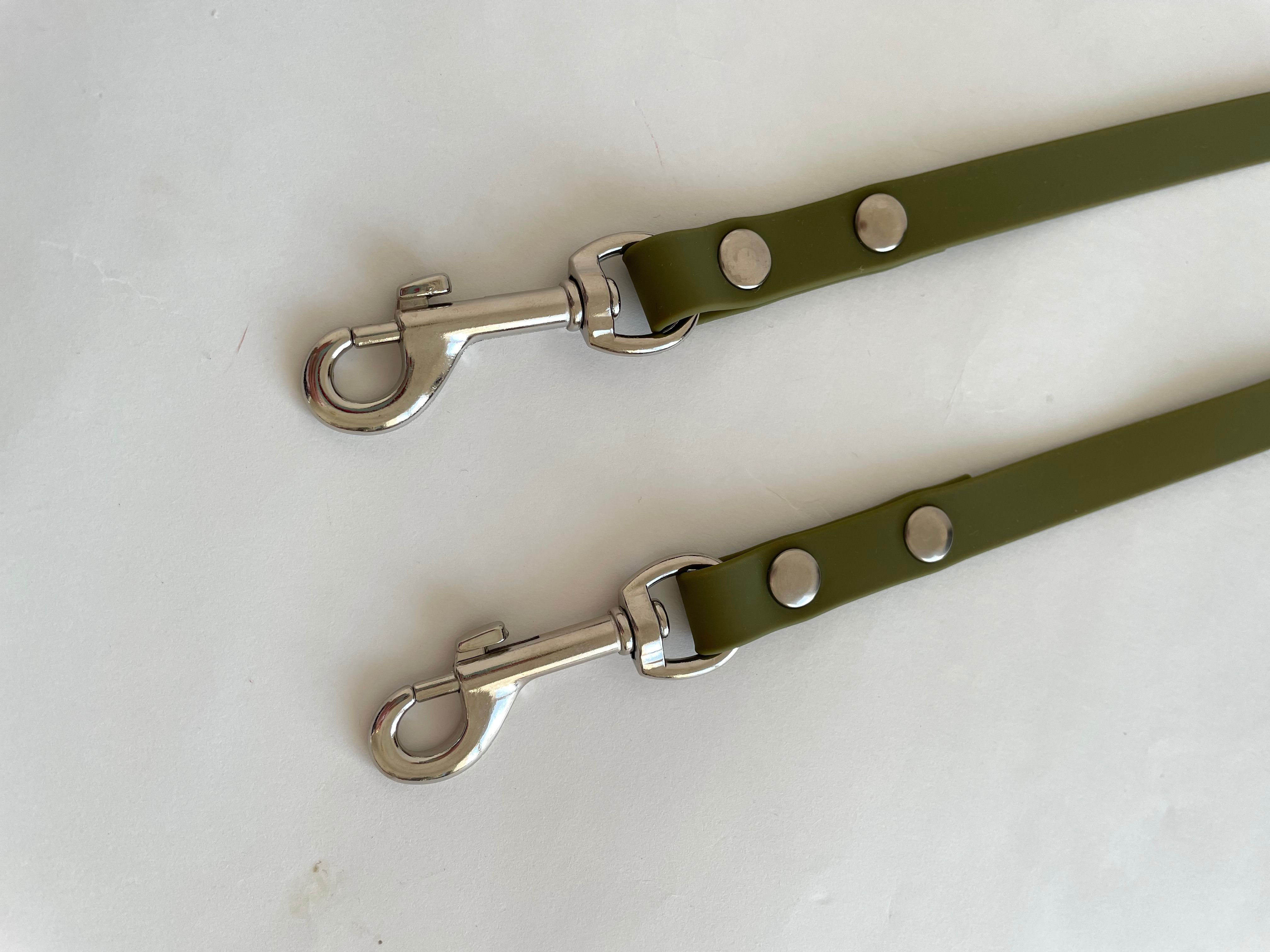 У сворки на двух концах вертлюги встроеные в сам карабин, это минимизирует запутывание собак. Ведь первое время собакам нужно привыкнуть к новому гаджету.